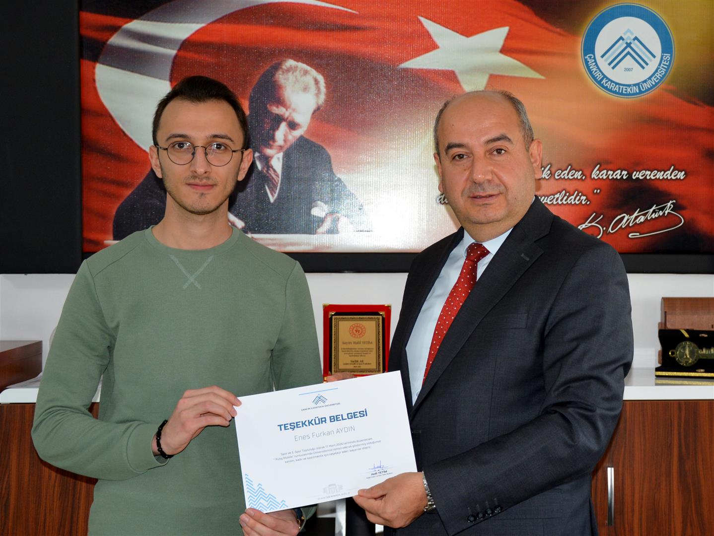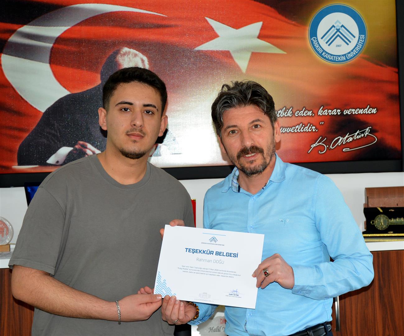 Başarılarının ardından sporcuları makamında kabul eden Çankırı Karatekin Üniversitesi Sağlık, Kültür ve Spor Daire Başkanı Halil Yetim, Ahmet Bakar, Enes Furkan Aydın ve Rahman Doğu’dan oluşan takım üyelerini tebrik ederek teşekkür belgesi ile ödüllendirdi.