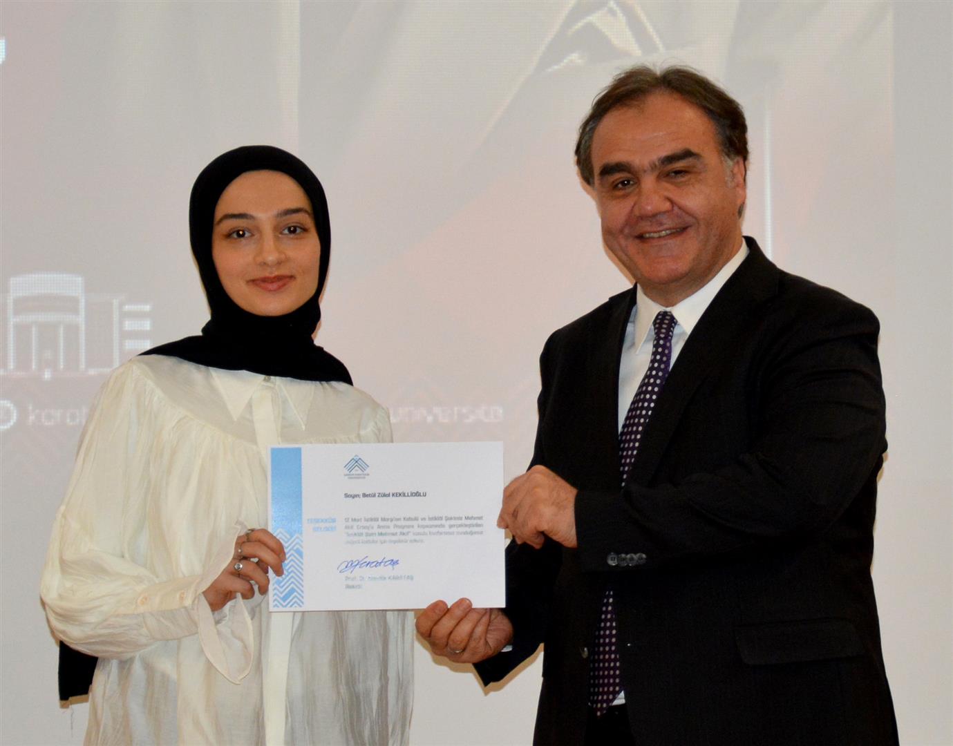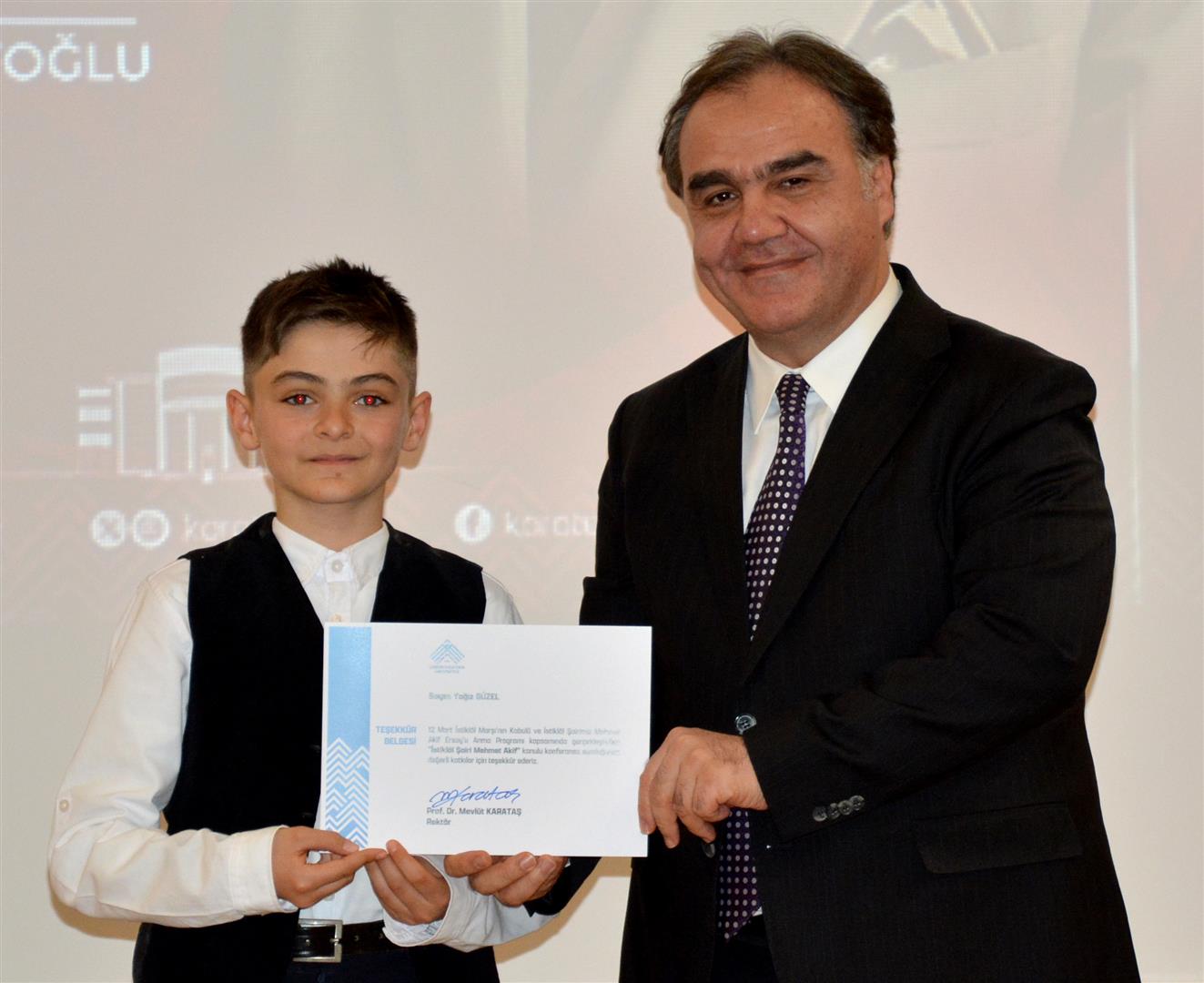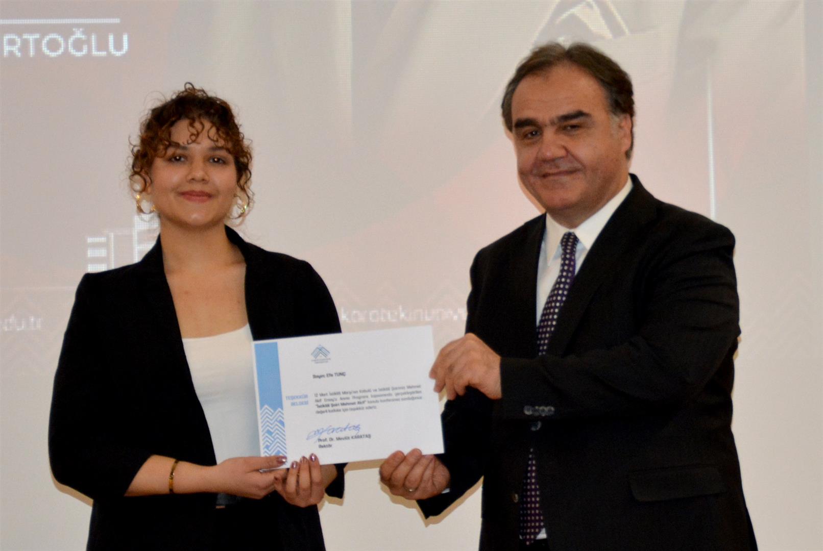 Rektör Karataş’ın konuşmasının ardından Mühendislik Fakültesi öğrencisi Betül Zülal Kekillioğlu, Hukuk Fakültesi öğrencisi Ece Tunç ve İstiklal Marşı’nı Güzel Okuma Yarışması il ikincisi ortaokul öğrencisi Yağız Güzel, İstiklal Marşı’nın tamamını okudu.
