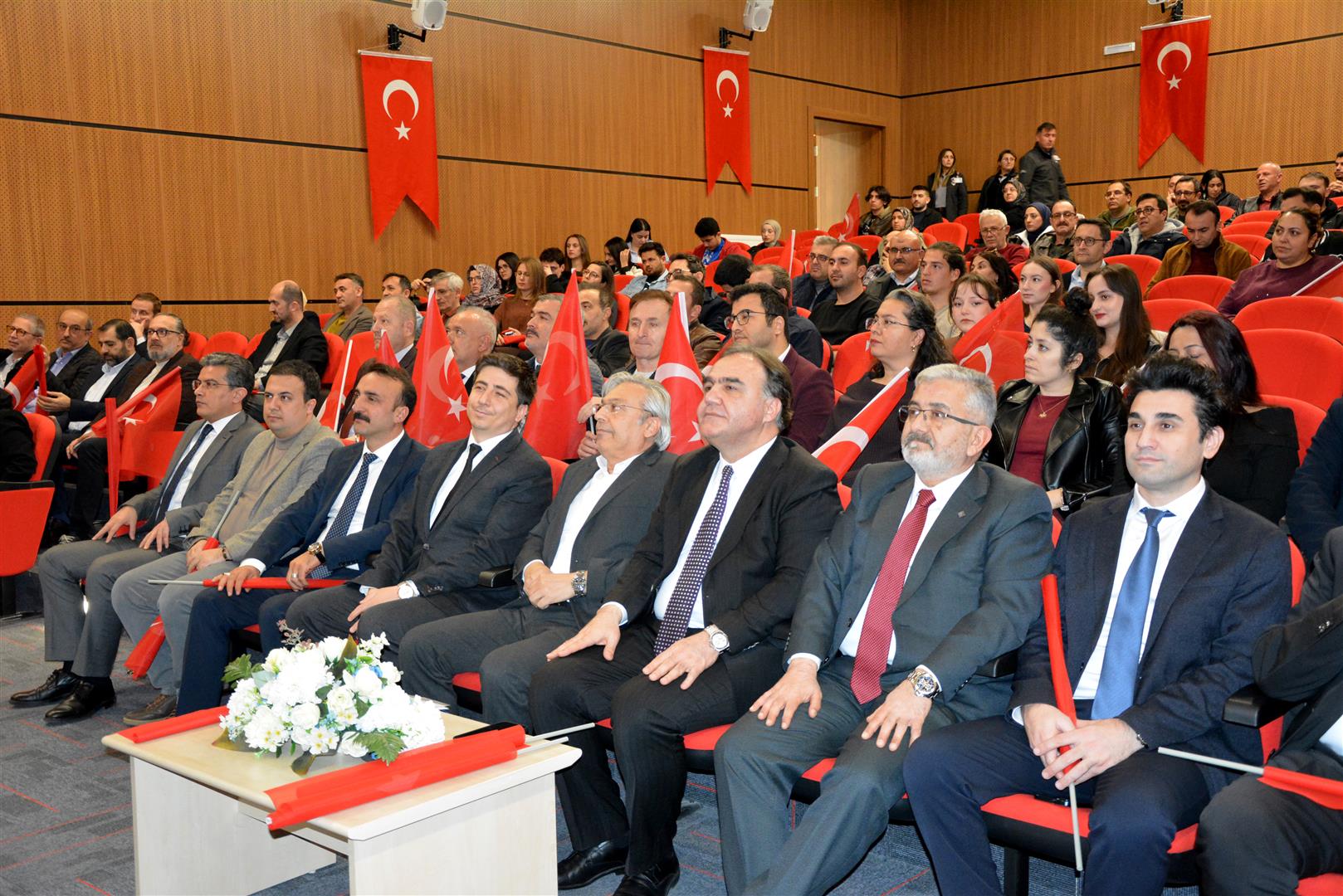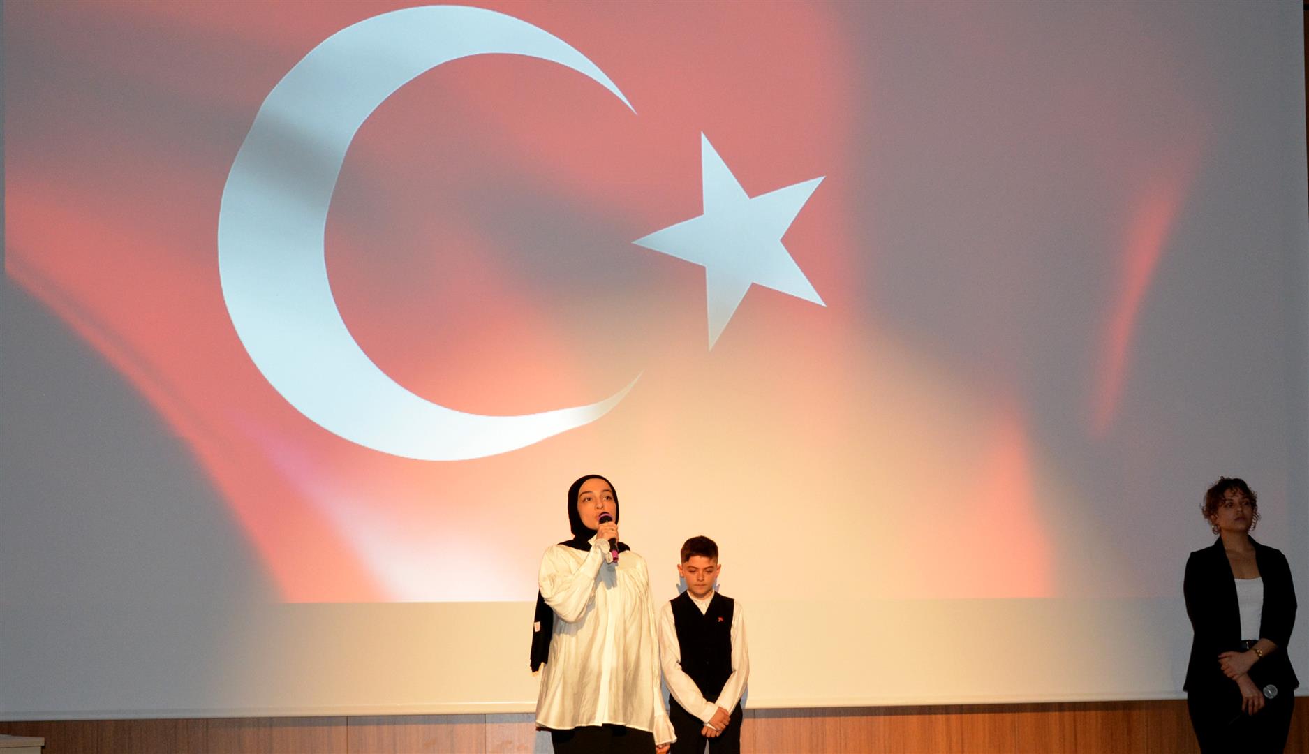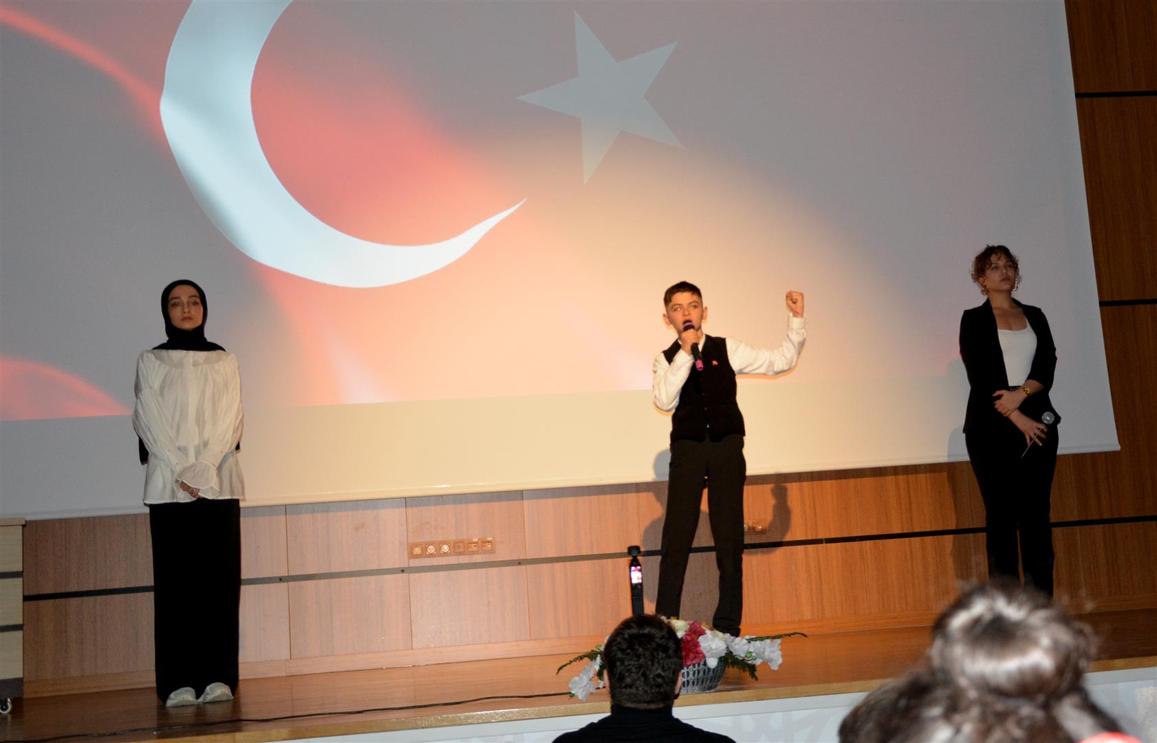 Rektör Karataş’ın konuşmasının ardından Mühendislik Fakültesi öğrencisi Betül Zülal Kekillioğlu, Hukuk Fakültesi öğrencisi Ece Tunç ve İstiklal Marşı’nı Güzel Okuma Yarışması il ikincisi ortaokul öğrencisi Yağız Güzel, İstiklal Marşı’nın tamamını okudu.