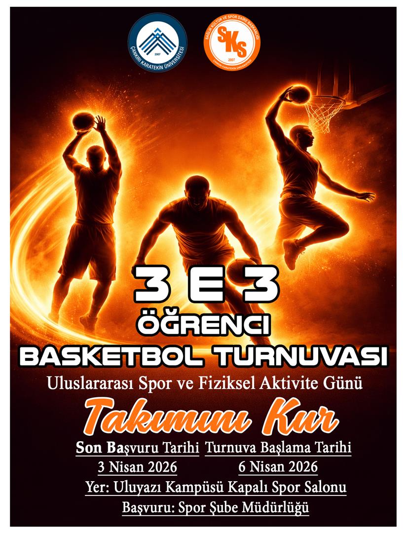 Üniversitemiz öğrencilerinin kaynaşması için Üniversitemiz Sağlık Kültür ve Spor Daire Başkanlığı Kültür Şube ve Spor Şube Müdürlüğü koordinesinde ”3 e 3 Basketbol Turnuvası” düzenlenecektir.